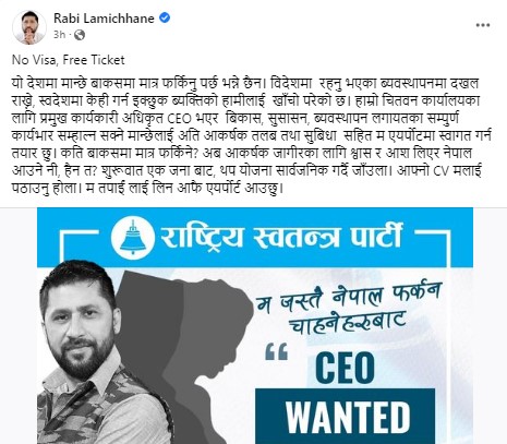 ‘हाम्रो चितवन कार्यालयका लागि प्रमुख कार्यकारी अधिकृत सीईओ भएर विकास, सुशासन, व्यवस्थापनलगायतका सम्पूर्ण कार्यभार सम्हाल्न सक्ने मान्छेलाई अति आकर्षक तलब तथा सुविधासहित म एयरपोर्टमा स्वागत गर्न तयार छु ।’ उनले भनेका छन् ।