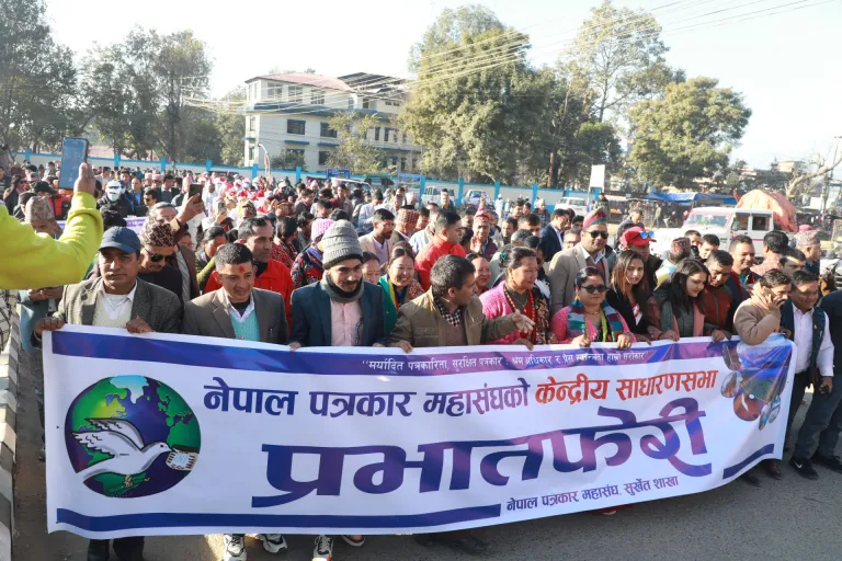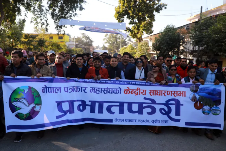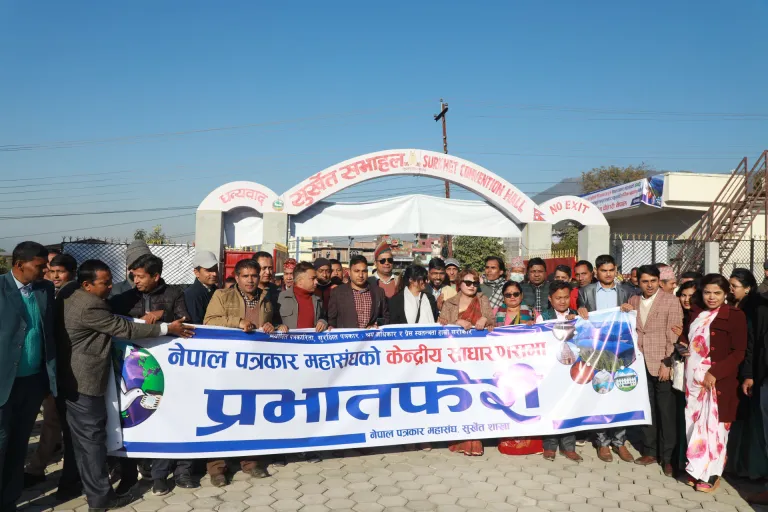 काठमाडौं । नेपाल पत्रकार महासङ्घको सुर्खेतमा हुने दुईदिने केन्द्रीय साधारणसभाका अवसरमा शुक्रबार आयोजित प्रभातफेरीमा सहभागी पत्रकारहरू । तस्बिर : रत्न श्रेष्ठ/ रासस