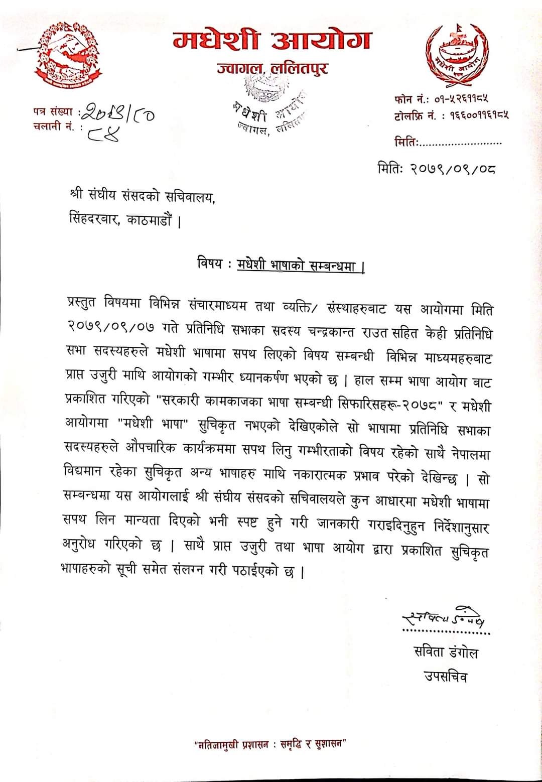 आयोगकी उपसचिव सविता डंगोलले संघीय संसदको सचिवालयलाई पठाएको पत्रमा सो भाषामा शपथ लिन संसद सचिवालयले कुन आधारमा मान्यता दिएको आयोगलाई स्पष्ट रुपमा जानकारी गराउन भनिएको छ ।