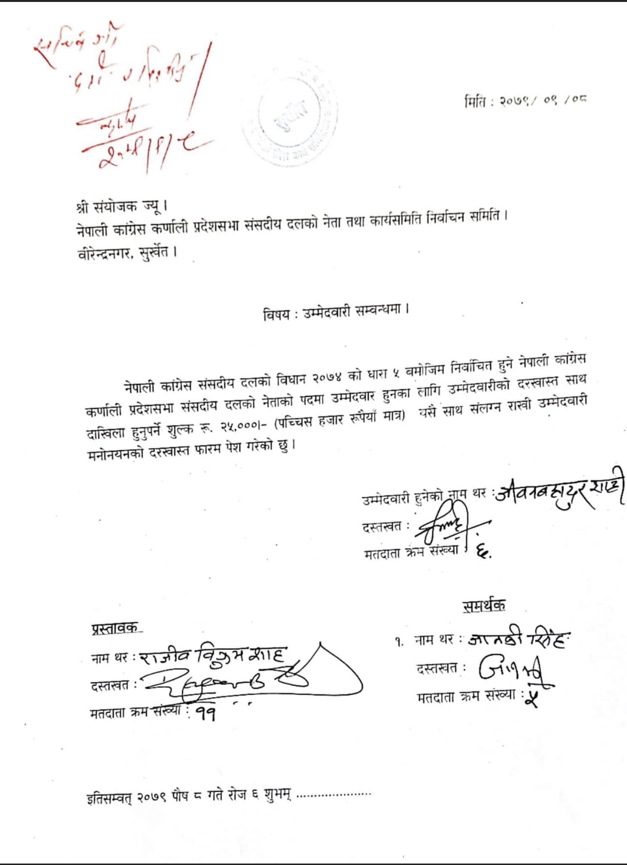 दलको नेतामा राजीवविक्रम शाहीको पनि दाबी रहेको थियो । यद्यपि उनले जीवनबहादुर शाहीलाई नै समर्थन गरेका छन् । दलको नेतामा एकल उम्मेदवारी परेका कारण उनी सर्वसम्मत चयन भएका हुन् ।