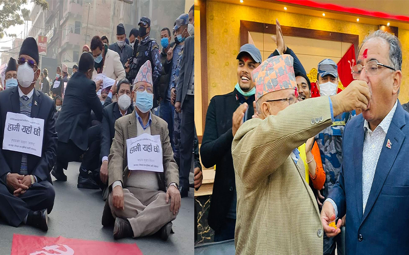 ओलीले संसद विघटन गरेपछि पुस १० गते निर्वाचन आयोग र सर्वोच्च अदालतलाई दबाब बढाउन उनीहरु सडक संघर्षमा निस्किएका थिए । प्रतिनिधिसभा विघटन गर्ने सरकारको निर्णय सर्वोच्च अदालतले २०७७ फागुन ११ मा बदर गरेसँगै प्रचण्ड–माधव नेपालले एकअर्कामा लड्डु खुवाएर खुशी साटासाट गरेका थिए ।
