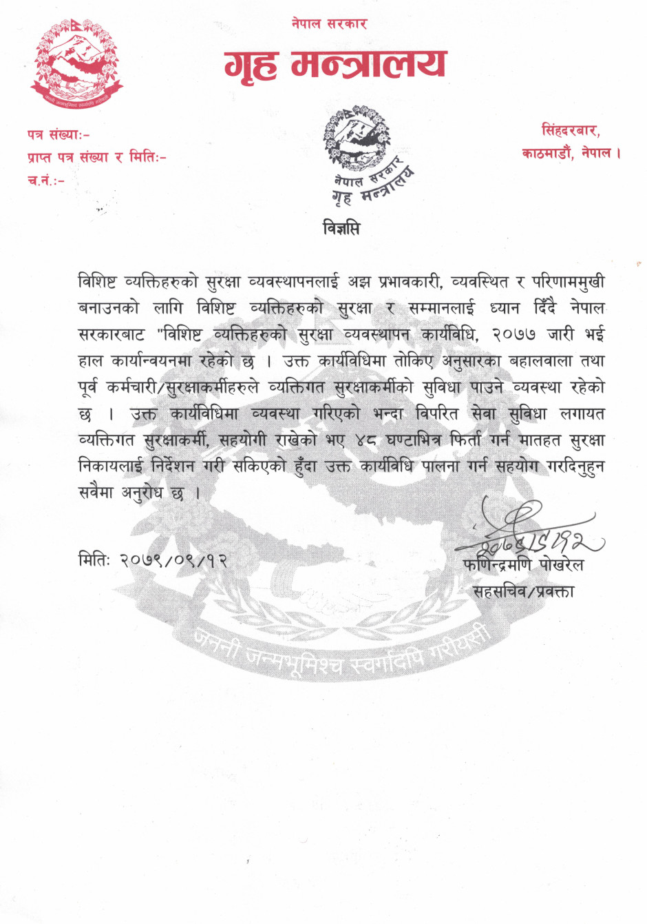 मंगलबार मन्त्रालयका सहसचिव एवं प्रवक्ता फणिन्द्रमणि पोखरेलले एक विज्ञप्ति जारी गर्दै मातहत सुरक्षा निकायलाई निर्देशन दिइएका हुन्।
