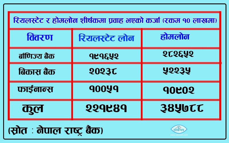बैंक तथा फाईनान्स कम्पनीहरुको निक्षेप तथा कर्जा सम्वन्धी नेपाल राष्ट्र बैंकको पछिल्लो चार महिनाको विस्तृत प्रतिवेदन अनुसार सञ्चालनमा रहेका २६ बाँणिज्य बैंक, १७ वटा बिकास बैंक र १७ वटा फाईनान्स कम्पनी सहितका ६० वटा संस्थाहरुले रियलस्टेट क्षेत्रमा मात्र दुई खर्ब २१ अर्ब ९४ करोड १० लाख रुपैंयाँ कर्जा प्रवाह गरेको देखिएको हो ।