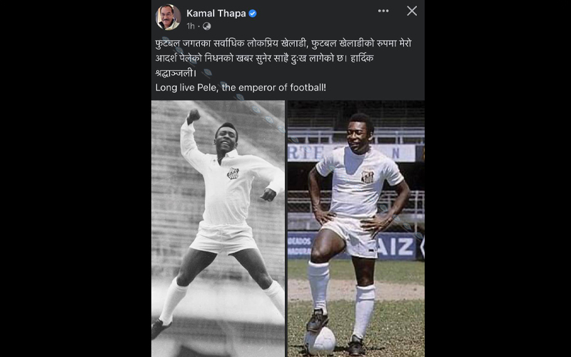 उनको निधनको खबरहरु सामाजिक सञ्जालमा आइरहेका भएपनि त्यसमा सत्यता भने छैन । यसैबीच राप्रपा नेपालका अध्यक्ष कमल थापाले आज बिहानै आफ्नो सामाजिक सञ्जालमा एक पोस्ट गरे । उनले जीवित रहेका पेलेलाई श्रद्धाञ्जली दिन भ्याए ।