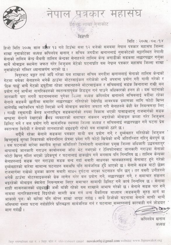 बिदुरबाट बट्टारतर्फ जाँदै गरेका सचिव खनाललाई तालिम केन्द्रको गेटमा बसेका सेनाहरुले भनेको ठाउँमा मोटरसाइकल नरोकेको भन्दै सडकमै अपशब्द गरी गाली गर्दै ‘ठीक पार्ने धम्की दिएको अध्यक्ष खनालले शुक्रबार जारी गरेको विज्ञप्तिमा उल्लेख छ ।