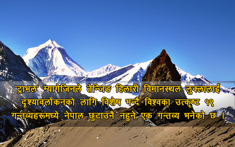 नेपालीको लागि एउटा खुसीको खबर छ । हालै विश्वको पर्यटन सम्बन्धि -याकिङ्ग गर्ने ‘ट्राभल’ नामक म्यागेजिनले नेपाललाई घुम्नैपर्ने देशको सूचीमा राखेको छ । साथै उसले नेपालमा सेप्टेम्वरदेखि नोभेम्बरसम्म खुल्ला तथा निलो आकाशको अवलोकन सहित विभिन्न रोमाञ्चक दृश्यहरुको अवलोकन गर्न पाईने बताएको छ ।