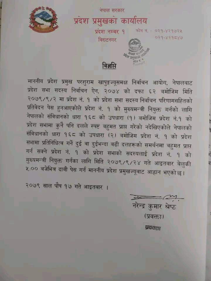 प्रदेश १ मा सरकार गठनका लागि प्रदेश प्रमुखको आह्वान, दिए एक साताको समय