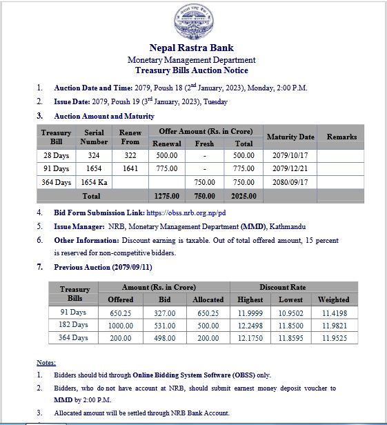 पुस १९ गते जारी मिती तोकिएको ट्रेजरी खरिदको लागि वाणिज्य बैंक, विकास बैंक र फाइनान्स कम्पनीहरुले भाग लिन सक्ने छन् । राष्ट्र बैंकका अनुसार जारी गरिने कुुल ट्रेजरी बिल मध्येमा २८ दिने अवधिको पाँच अर्ब, ९१ दिने अवधिको सात अर्ब ७५ करोड र तीन सय ६४ दिने अवधिको सात अर्ब ५० करोड रुपैयाँको रहेका छन् ।