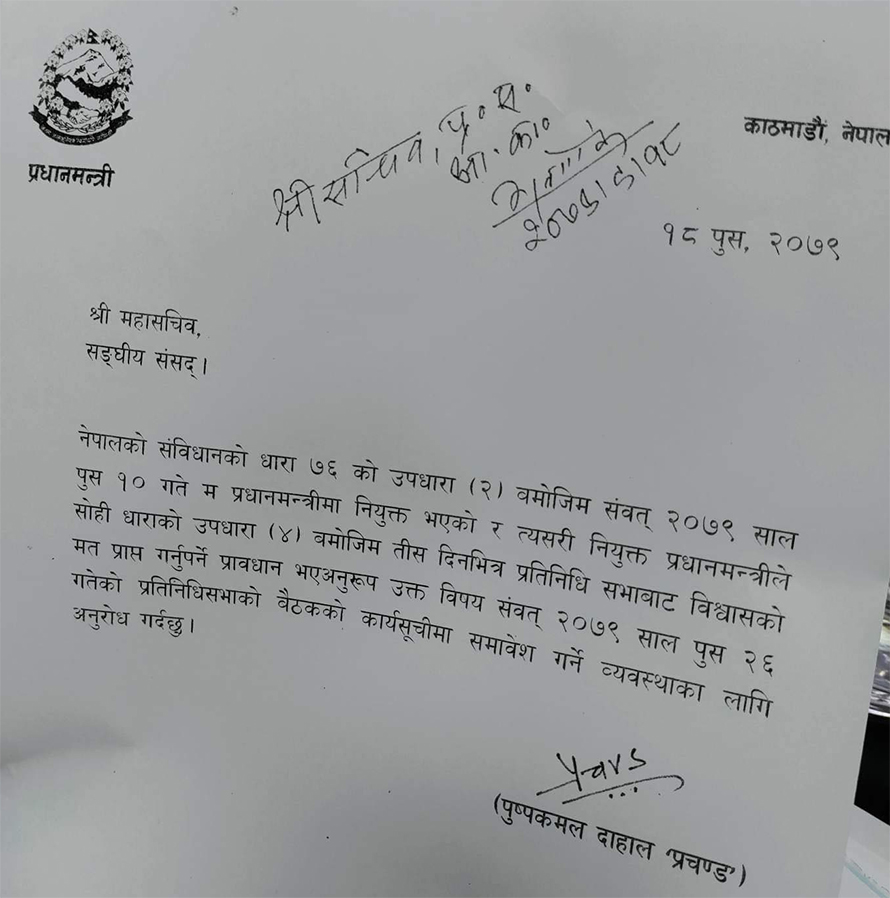 काठमाडौं । प्रधानमन्त्री पुष्पकमल दाहाल प्रचण्डले पुस २६ गते विश्वासको मत लिने भएका छन् । प्रधानमन्त्री प्रचण्डले संघीय संसदका महासचिवलाई पत्र लेख्दै आफूले २६ गते विश्वासको मत लिने बताएका हुन् ।