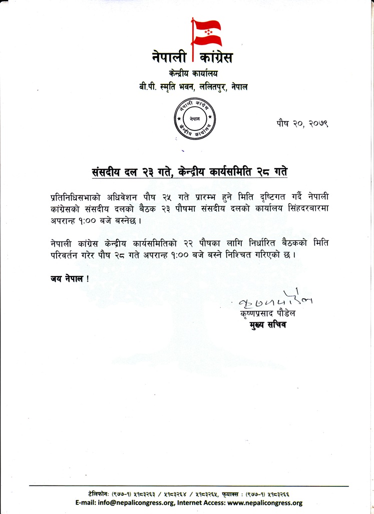 ‘प्रतिनिधिसभाको अधिवेशन पौष २५ गते प्रारम्भ हुने मिति दृष्ट्रिगत गर्दै नेपाली कांग्रेसको संसदीय दलको बैठक २३ पौषमा संसदीय दलको कार्यालय सिंहदरबारमा अपरान्ह १ः०० बजे बस्नेछ ।’ जारी विज्ञप्तिमा भनिएको छ ।