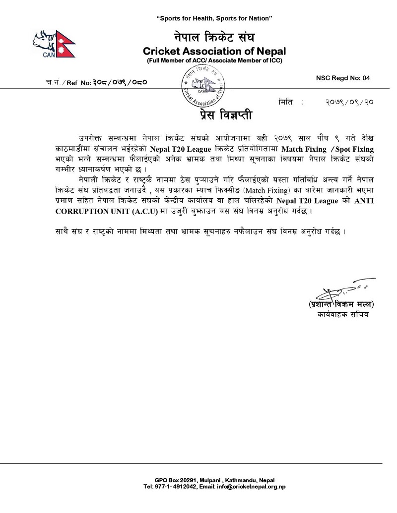 ‘नेपाल क्रिकेट संघको आयोजनामा यही २०७९ साल पौष ९ गतेदेखि काठमाडौंमा सञ्चालन भइरहेको नेपाल टी–२० लिग क्रिकेट प्रतियोगितामा म्याच फिक्सिङ तथा स्पोर्ट फिक्सिङ भएको भन्ने सम्बन्धमा फैलाइएको अनेक भ्रम तथा मिथ्या सूचनाका विषयमा नेपाल क्रिकेट संघको ध्यानाकर्षण भएको छ ।’ जारी विज्ञप्तिमा भनिएको छ ।