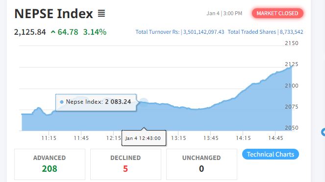 बुधवार नेप्से परिसूचक ६४.८७ अंकले बढेर २१२५.९४ बिन्दुमा पुगेको हो । नयाँ सरकार बनेर अर्थमन्त्री विष्णु पौडेल आएसँगै शेयर बजार निरन्तर रुपमा उकालो लाग्दै आएको छ । त्यस्तै बुधवार नेप्से परिसूचकसँगै सेन्सेटिभ इण्डेक्स पनि १४.०९ अंकले बढेको छ भने फ्लोट इण्डेक्स ४.२८ अंक र सेन्सेटिभ फ्लोट इण्डेक्स ४.८८ अंकले बढेको छ ।