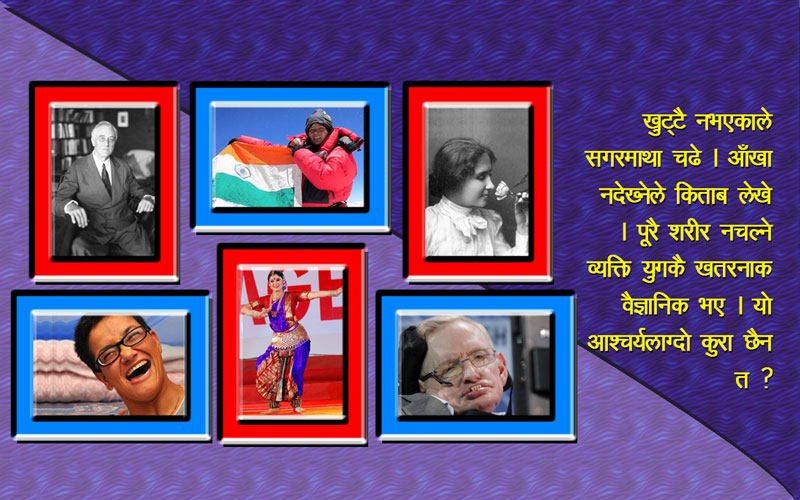 कोही जन्मिदै शारीरिक रुपमा अशक्त थिए, कोही दुर्घटनामा परेर अशक्त हुन पुगे । तर, शारीरिक अशक्तताले उनीहरुको सपनामा अङ्कुश लगाउन भने सकेन । न उनीहरुले आफ्नो कमजोरीलाई जीवनमा हावी हुन दिए न त पुर्पुरो ठोक्दै बिलौना गाएर समय बर्बाद गरे । बरु, आफ्नो ‘समस्या’लाई ‘शक्ति’ मा परिणत गरे । र, सबैका निमित्त उदाहरण बने ।