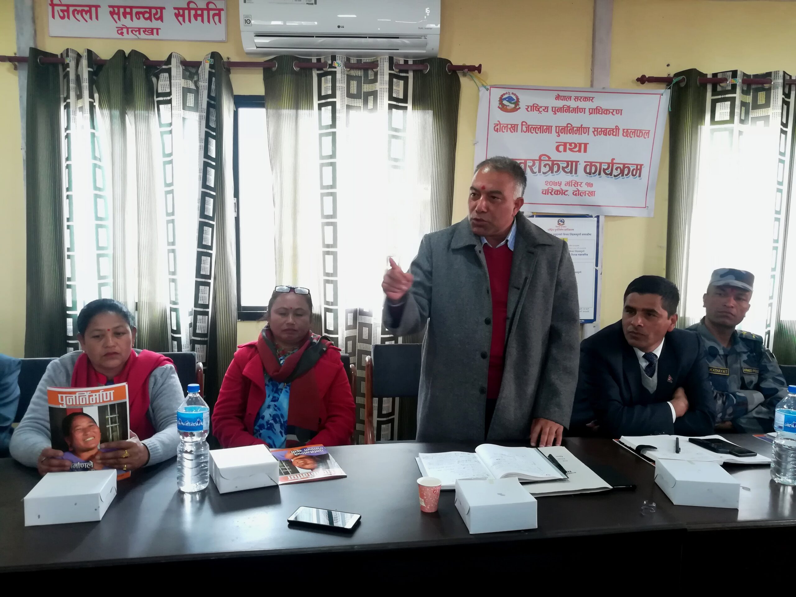 पुनर्निर्माण सम्बन्धी दोलखाको चरिकोटमा आयोजित कार्यक्रममा उहाँले यसअघिको सर्वेक्षणमा छुट भएका भूकम्प पीडितको पुन: सर्वेक्षण गर्ने र सम्बन्धित वडा तथा स्थानीय तहको सिफारिसमा लाभग्राही गरेर सबै गुनासाका सम्बोधन गर्ने बताएका हुन् ।