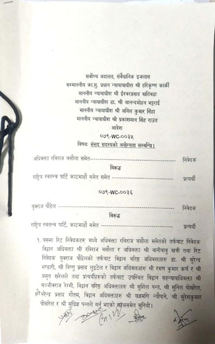 शुक्रबार कामु प्रधानन्यायाधीश हरिकृष्ण कार्की, न्यायाधीशहरू ईश्वरप्रसाद खतिवडा, डा आनन्दमोहन भट्टराई, अनिलकुमार सिन्हा र प्रकाशमान सिंह राउतको संवैधानिक इजलासले अन्तरिम आदेश नहुने आदेश जारी गरेको हो।