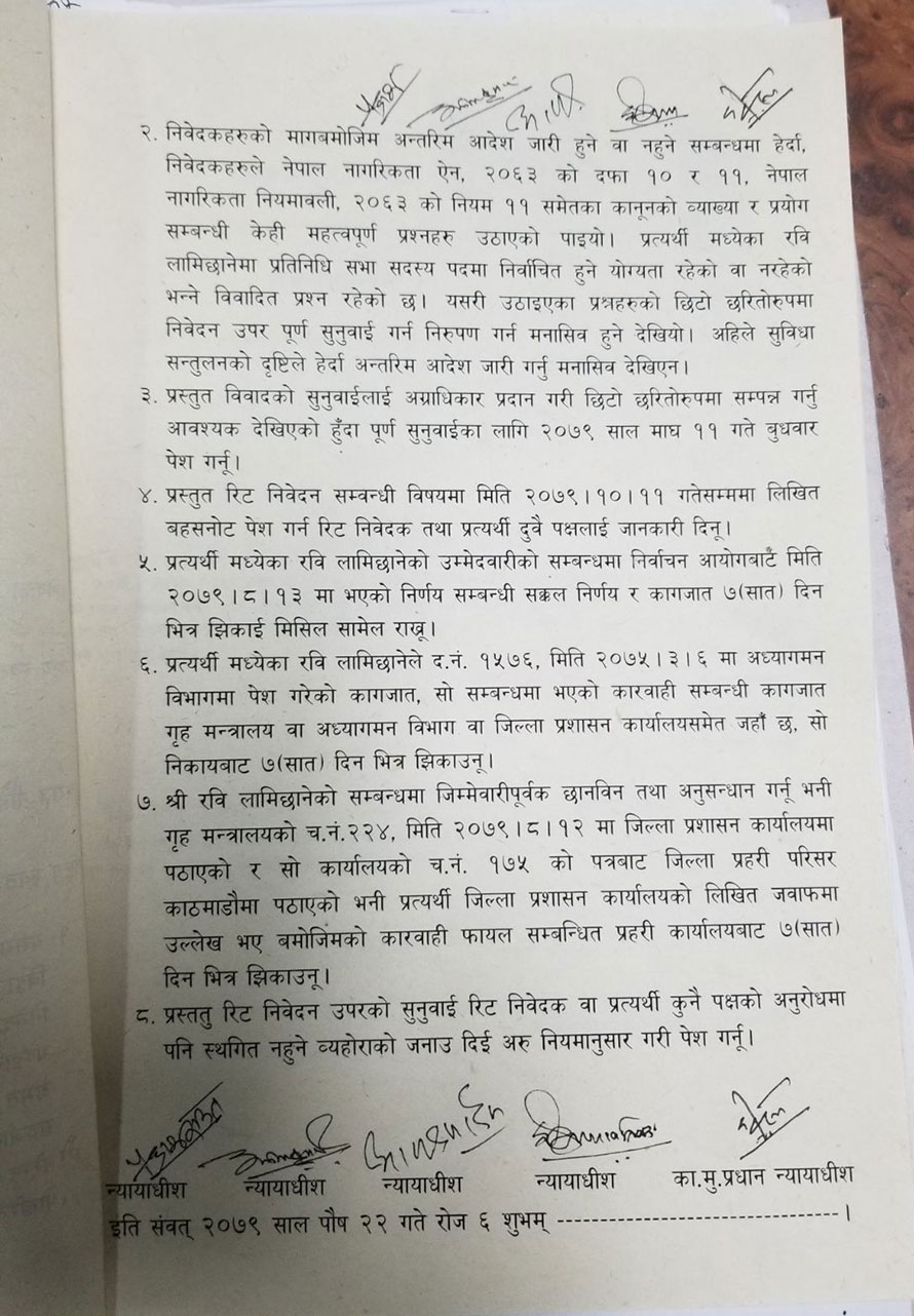 काठमाडौं। उपप्रधान एवम् गृहमन्त्री रवि लामिछानेको नागरिकतासम्बन्धी विवादमा अन्तरिम आदेश जारी नहुने भएको छ ।