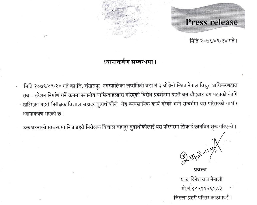 काठमाडौं । नेपाल विद्युत प्राधिकरणद्वारा सब–स्टेशन निर्माण गर्ने क्रममा खटिएका प्रहरीबाट गैरव्यावसायिक क्रियाकलाप गरेको भन्दै जिल्ला प्रहरी परिसर काठमाडौंले ध्यानाकर्षण भएको जनाएको छ ।