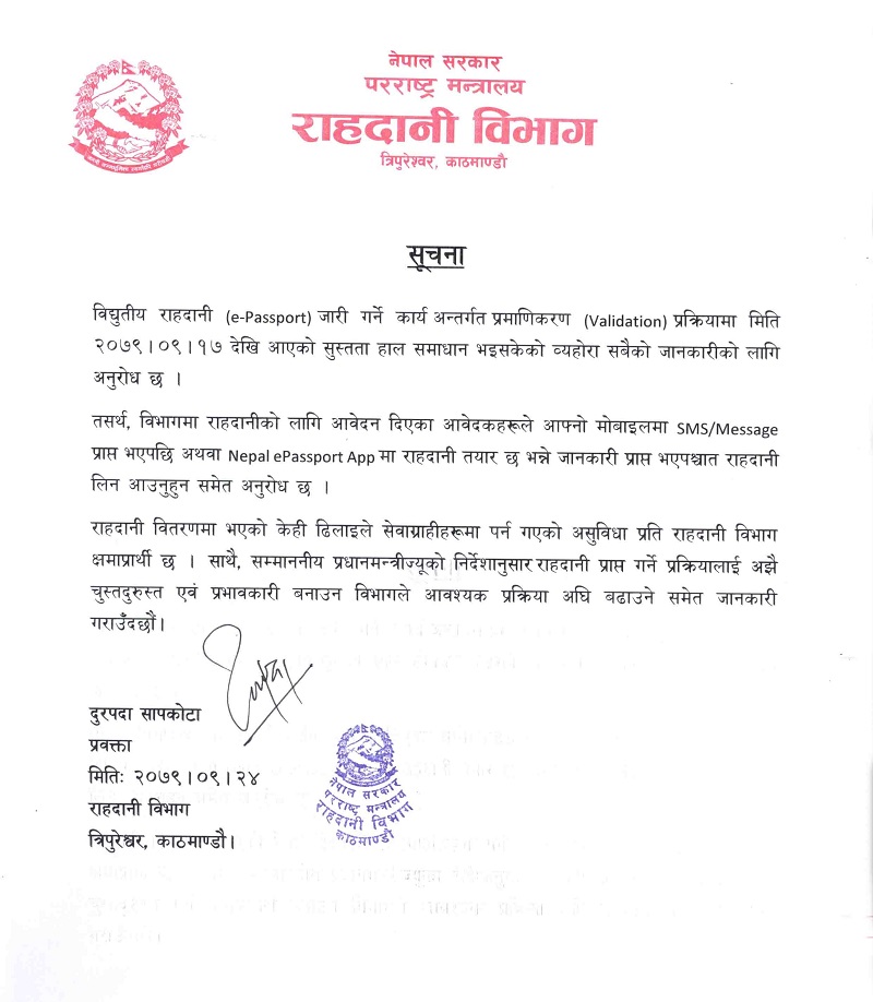 ‘विद्युतीय राहदानी जारी गर्ने कार्य अन्तर्गत प्रमाणीकरण प्रक्रियामा मिति २०७९–०९–१७ देखि आएको सुस्तता हाल समाधान भइससकेको व्यहोरा जानकारी गराउँदछौँ ।’ जारी विज्ञप्तिमा भनिएको छ ।