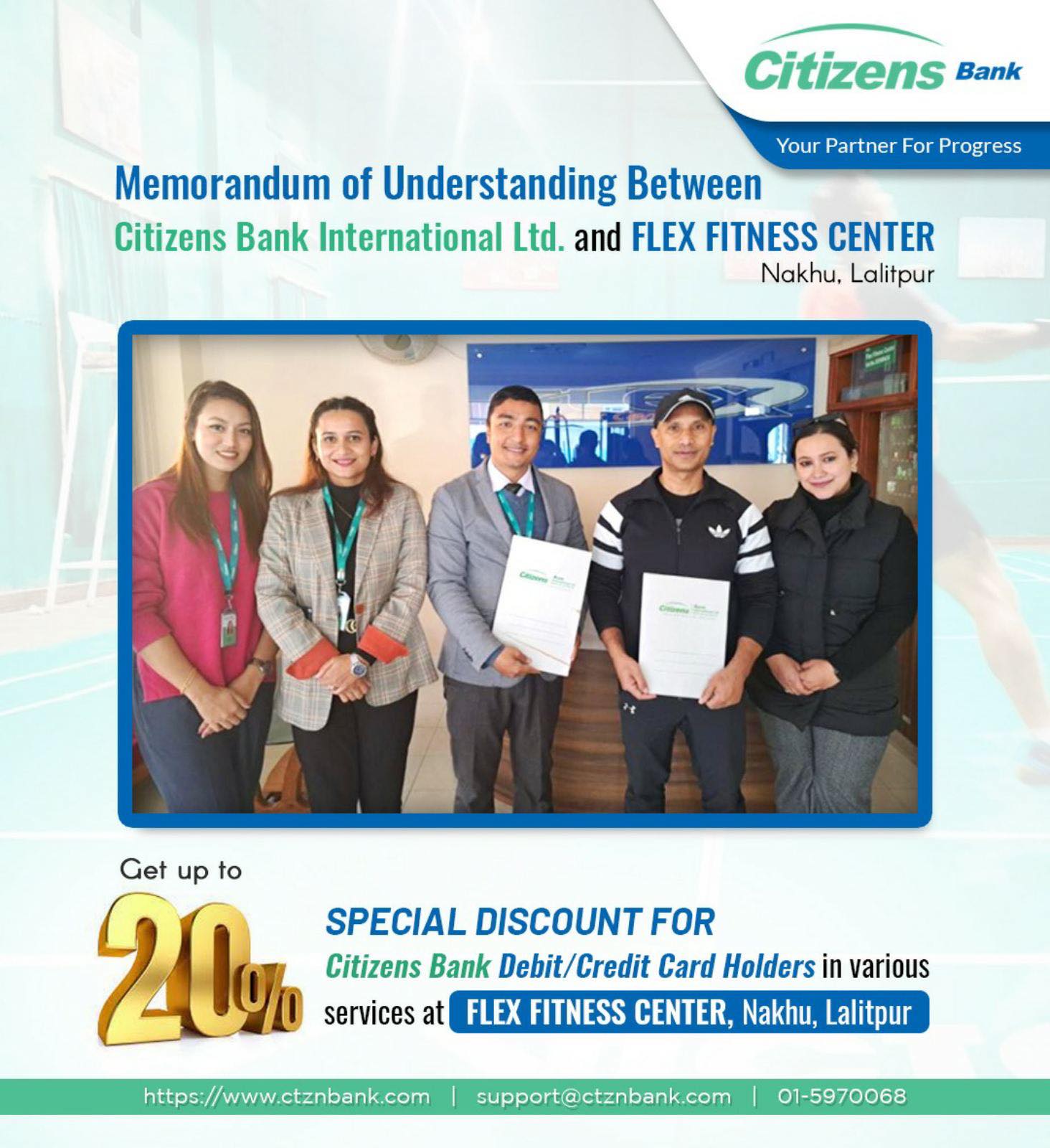 सो समझदारीपत्रमा हस्ताक्षर पश्चात् सिटिजन्स बैंकका कार्डबाहकहरुले फ्लेकश फिटनेस सेन्टरका विभिन्न सेवाहरुमा २० प्रतिशतसम्मको आकर्षक छुट पाउनेछन् ।