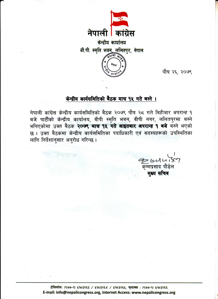 काठमाडौं । नेपाली कांग्रेस केन्द्रीय कार्यसमितिको बैठक आगामी माघ १५ गते बस्ने भएको छ । यही पुस २८ गते बिहीबार अपरान्ह १ बजे पार्टी केन्द्रीय कार्यालयमा बस्ने भनिएको केन्द्रीय समितिको बैठक माघ १५ गते आइतबार अपरान्ह १ बजे बस्ने भएको मुख्य सचिव कृष्णप्रसाद पौडेलले जानकारी दिए ।