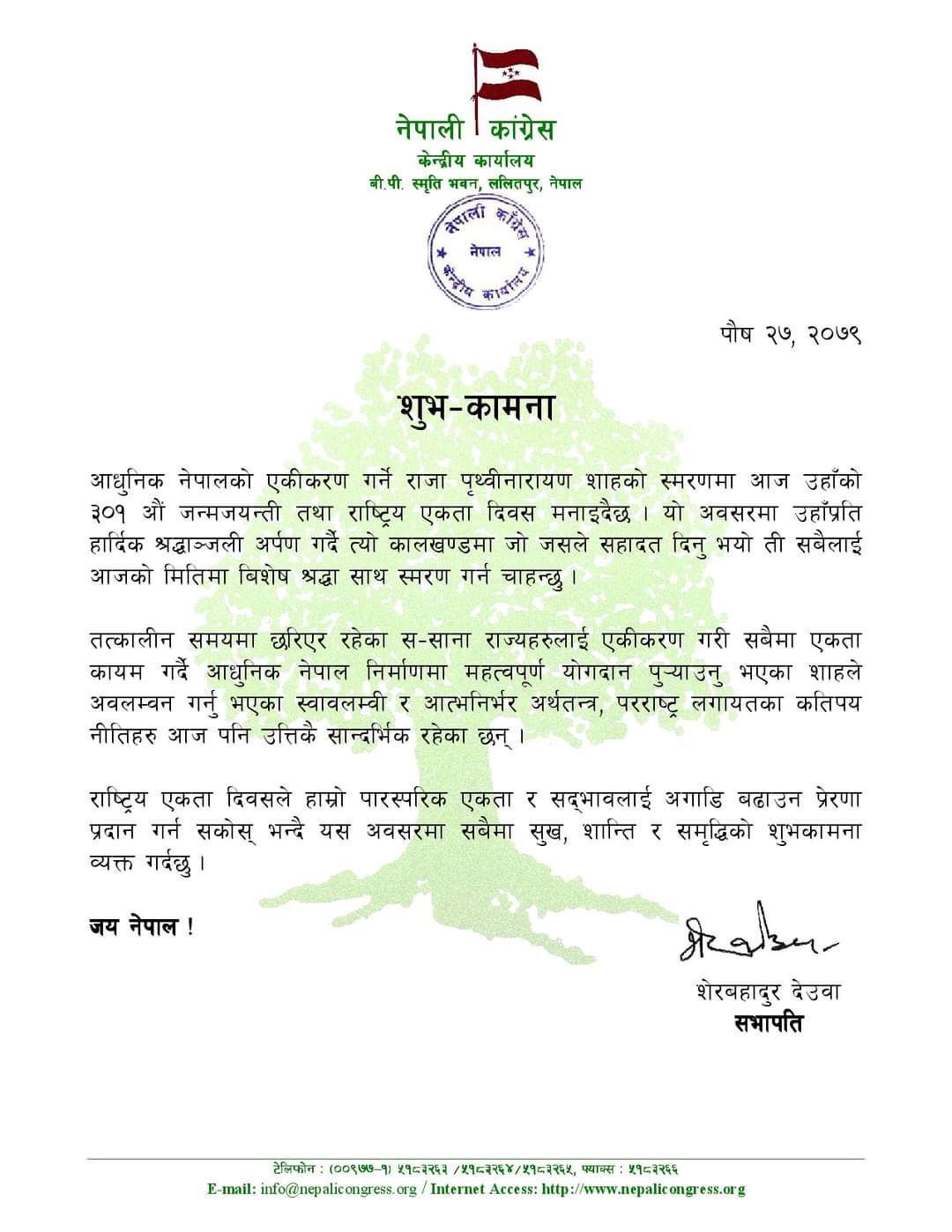 बुधबार एक सन्देश जारी गर्दै उनले भनेका छन्, ‘आधुनिक नेपालको एकीकरण गर्ने राजा पृथ्वीनारायण शाहको स्मरणमा आज उहाँको ३०१ औं जन्मजयन्ती तथा राष्ट्रिय एकता दिवस मनाइदैछ । यो अवसरमा उहाँप्रति हार्दिक श्रद्धाञ्जली अर्पण गर्दै त्यो कालखण्डमा जो जसले सहादत दिनु भयो ती सबैलाई आजको मितिमा बिशेष श्रद्धा साथ स्मरण गर्न चाहन्छु ।’
