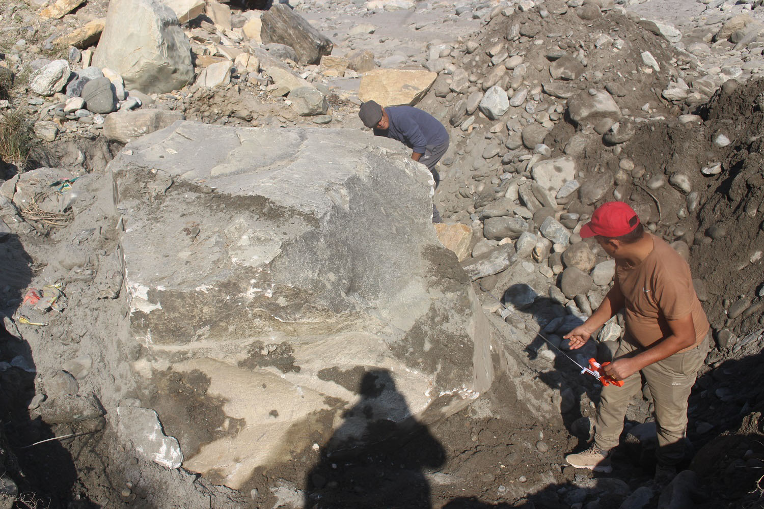 ‘एउटा १५–१६ मेट्रिक टन र अर्को ११–१२ मेट्रिक टन अनुमानित तौल भएको शिलाको नापजाँच भएको छ’, उपप्राध्यापक न्यौपानेले भने, ‘जैविक र वातावरणीय असर नपुग्ने गरी शिला उठाएर ट्रकमा राख्ने क्रेन मगाएका छौँ ।’ कालीगण्डकी नदीबाट पवित्र बनेका सात फिट लम्बाइ र पाँच फिट चौडाइका दुई थान शिलाको पहिचान गरिएको थियो ।