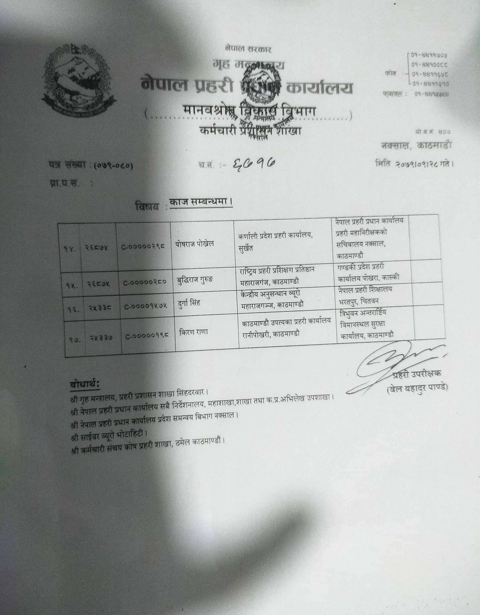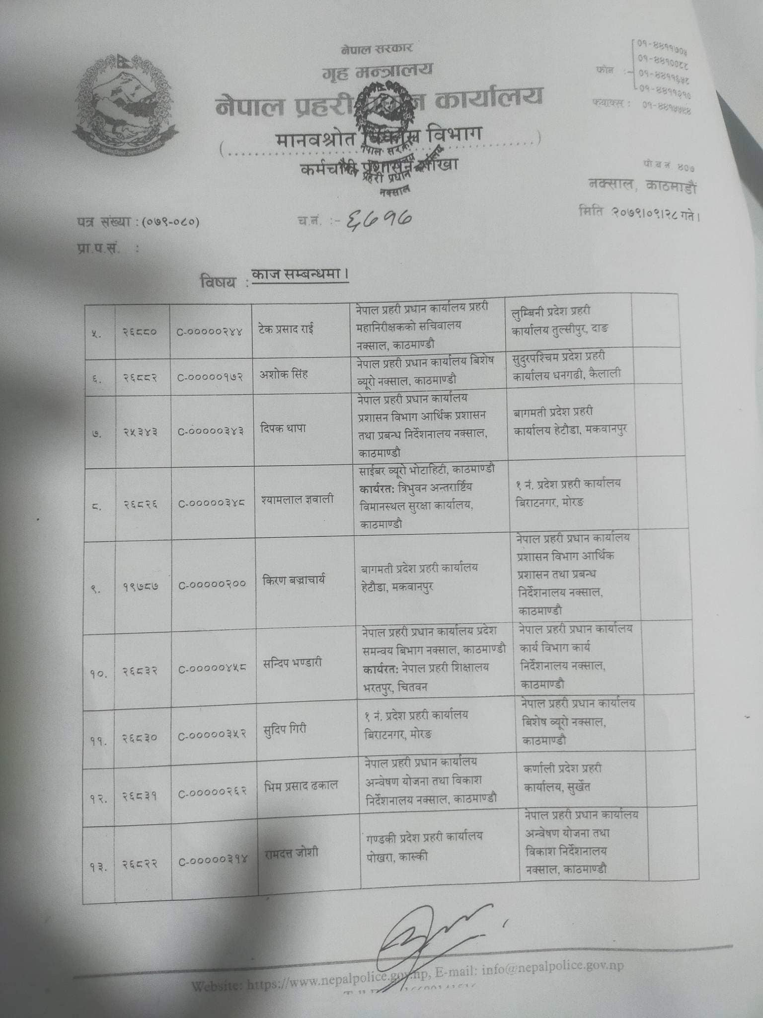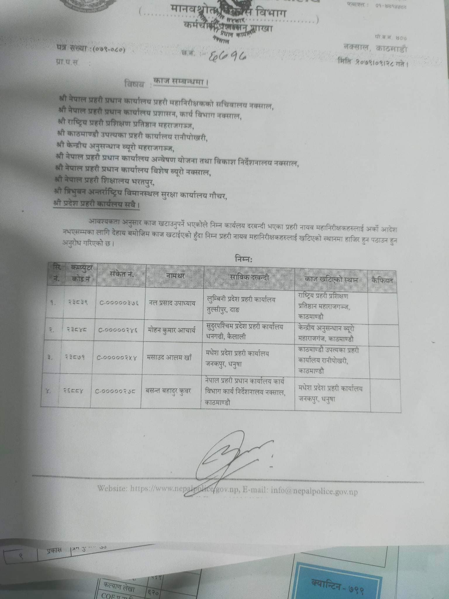 जसअनुसार प्रहरी प्रधान कार्यालय नक्सालको कार्य विभाग कार्य निर्देशनालयमा कार्यरत बसन्तबहादुर कुँवरलाई मधेश प्रदेश प्रहरी कार्यालय जनकपुर पठाइएको छ ।