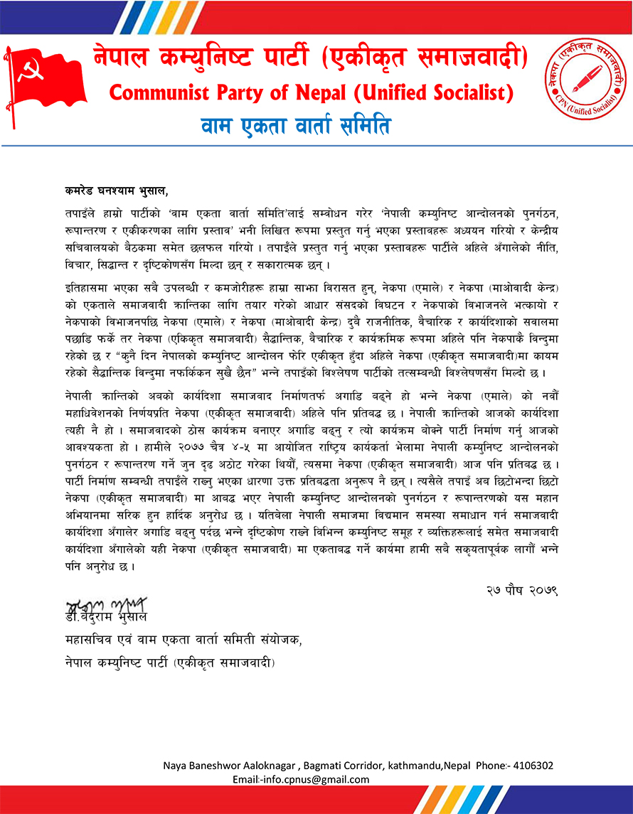 महासचिव बेदुराम भूषालले लेखेको पत्रमा भनिएको छ, ‘यतिबेला नेपाली समाजमा विद्ययमान समस्या समाधान गर्न समाजवादी कार्यदिशा अंगालेर अगाडि बढ्नुपर्दछ भन्ने दृष्टिकोण राख्ने विभिन्न कम्युनिस्ट समूह र व्यक्तिहरुलाई समेत समाजवादी कार्यदिशा अंगालेको यही नेकपा एकीकृत समाजवादीमा आवद्ध गर्ने कार्यमा हामी सबै सक्रियतापूर्वक लागौं भन्ने पनि अनुरोध छ ।’