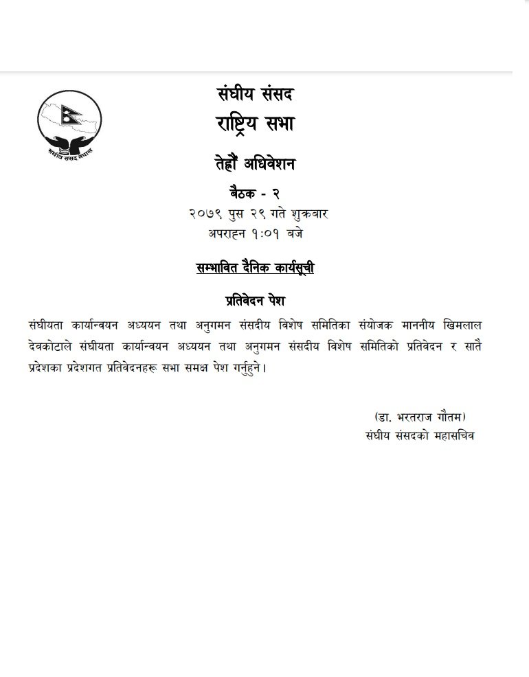 त्यसैगरी सातै प्रदेशका प्रदेशगत प्रतिवेदनहरु सभा समक्ष पेश गर्ने कार्यसूची रहेको छ ।