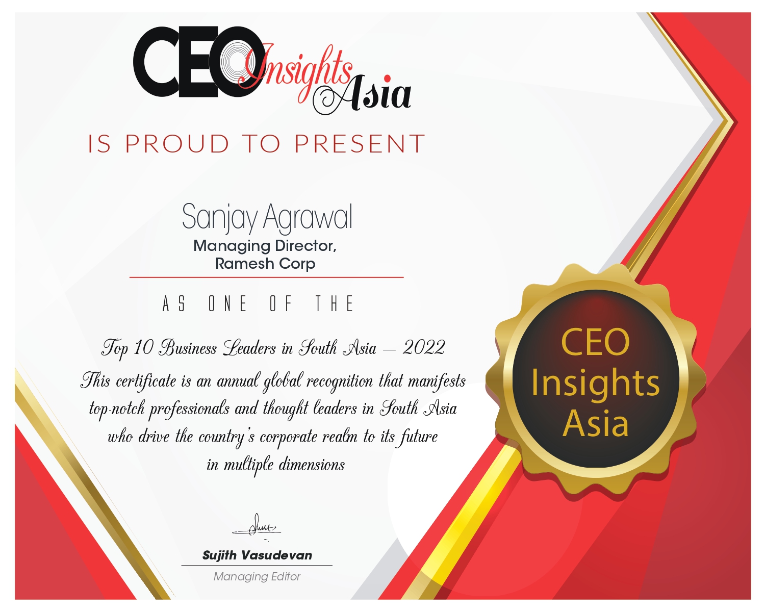 सीईओ इनसाइट एशिया द्वारा श्री सञ्जय अग्रवाललाई ‘दक्षिण एशियाका उत्कृष्ट १० बीजनेस लिडर्सरू– २०२२’ मध्ये एकको रूपमा सम्मान उनको असाधारण नेतृत्व, योगदान र नेपाल तथा अन्य दक्षिण एशियाली देशहरूमा मोबाइल र कन्ज्युमर ड्युरेबल उद्योगहरूमा प्रभावको प्रमाण हो । उनको योगदानले समाजमा महत्वपूर्ण प्रभाव पारेको छ, र उनी यस सम्मानको हकदार छन् ।