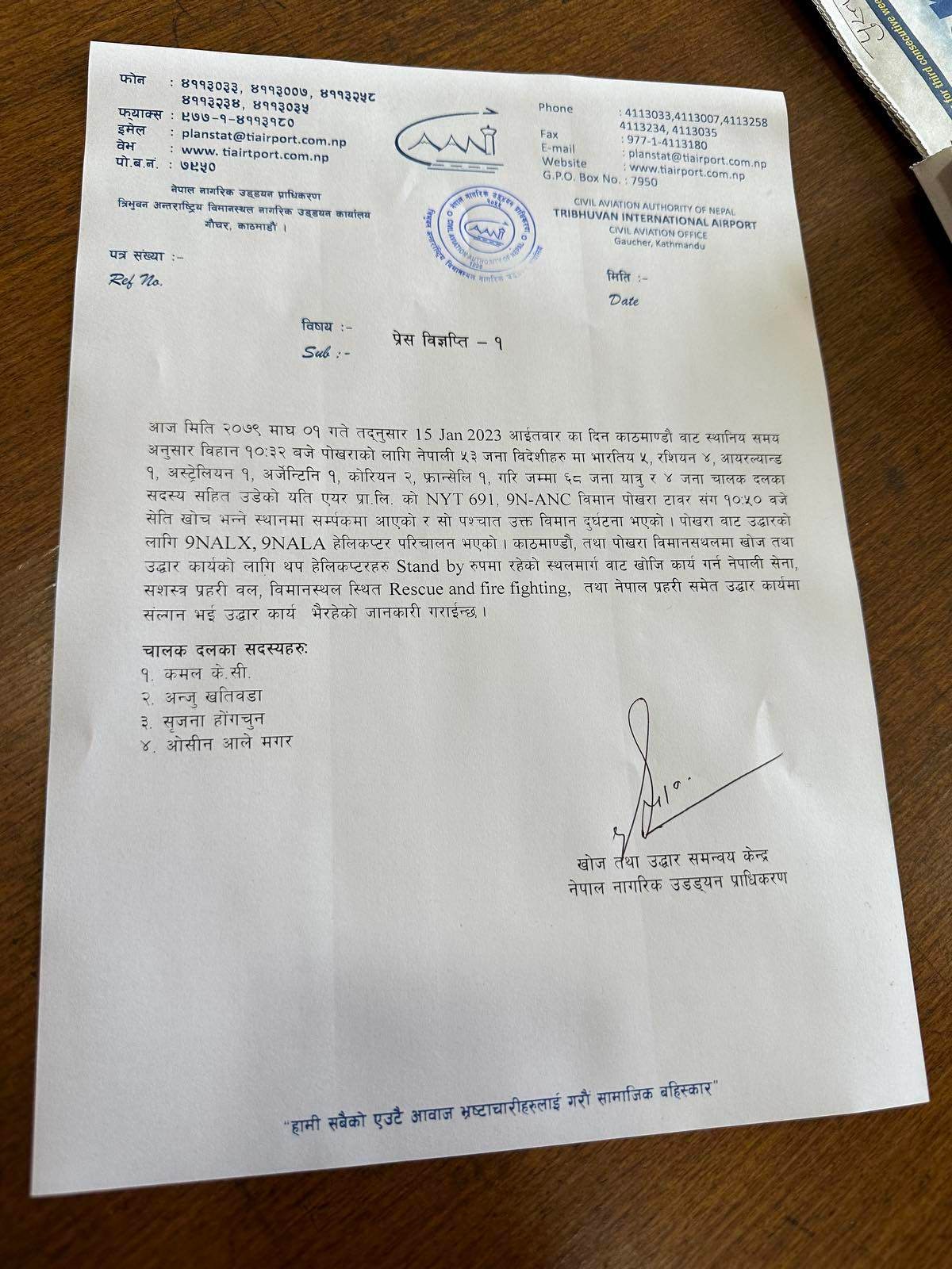 बिहान काठमाडौंबाट पोखराका लागि उडेको विमानमा कमल केसी, अन्जु खतिवडा, सृजना होंगचुन र ओसीन आलेमगर रहेको नागरिक उड्डयन प्राधिकरणले जनाएको छ ।