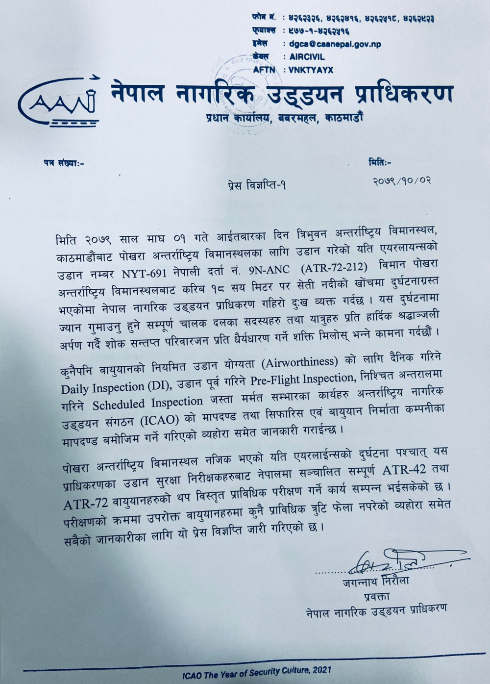 ‘पोखरा अन्तराष्ट्रिय विमानस्थल भएको यति एयरलाइन्सको दुर्घटना पश्चात् यस प्राधिकरणका उडान सुरक्षा निरीक्षकहरुबाट नेपालमा सञ्चालित सम्पूर्ण एटीआर–४२ तथा एटीआर–७२ वायुयानहरुको थप विस्तृत प्राविधिक परीक्षण गर्ने कार्य सम्पन्न भइसकेको छ ।