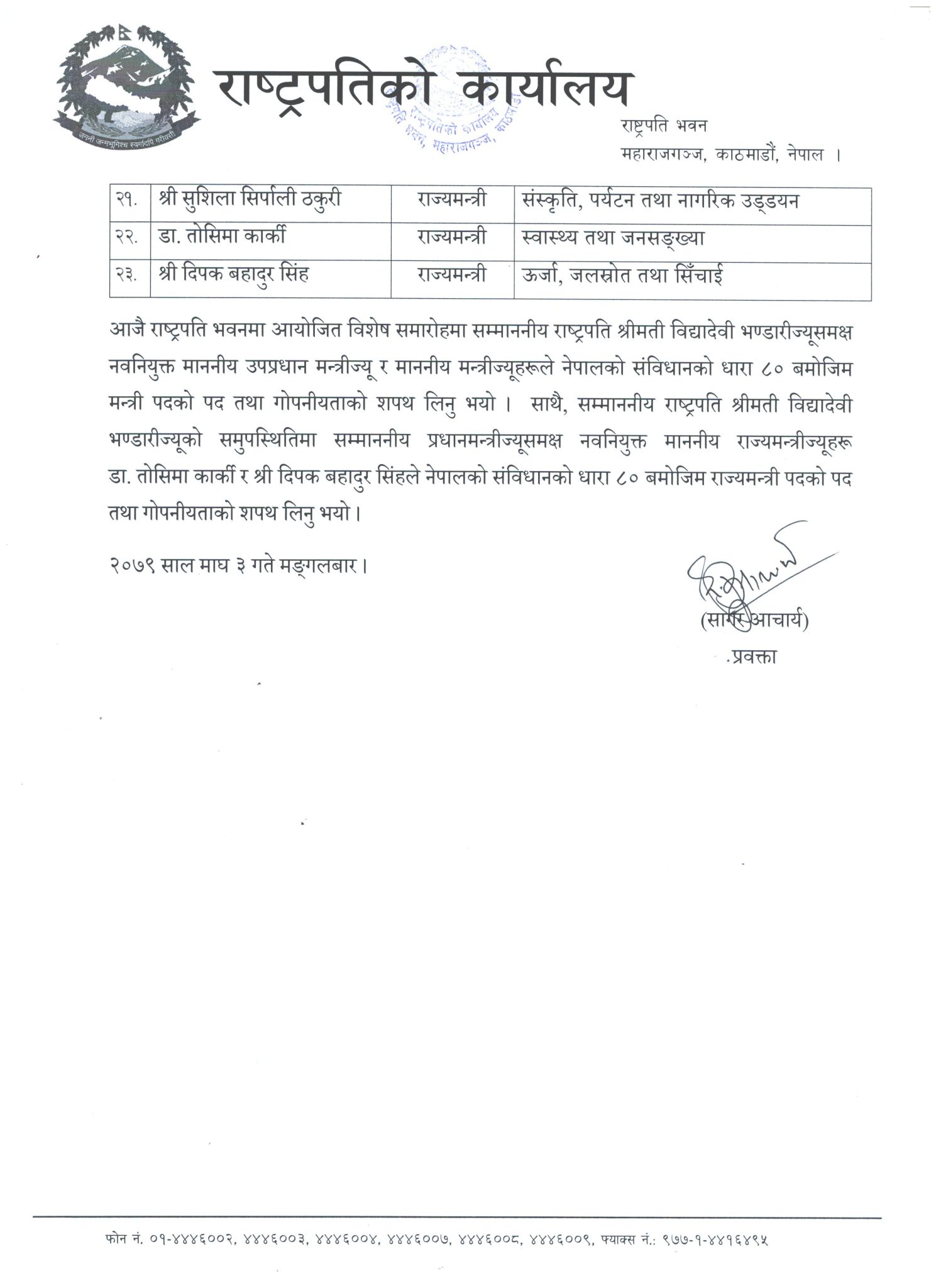 त्यसपछि मन्तीहरुको वरियतामा सञ्चार एवं सूचनाप्रविधिमन्त्री रेखा शर्मा, शहरीविकास मन्त्री विक्रम पाण्डे रहेका छन् ।