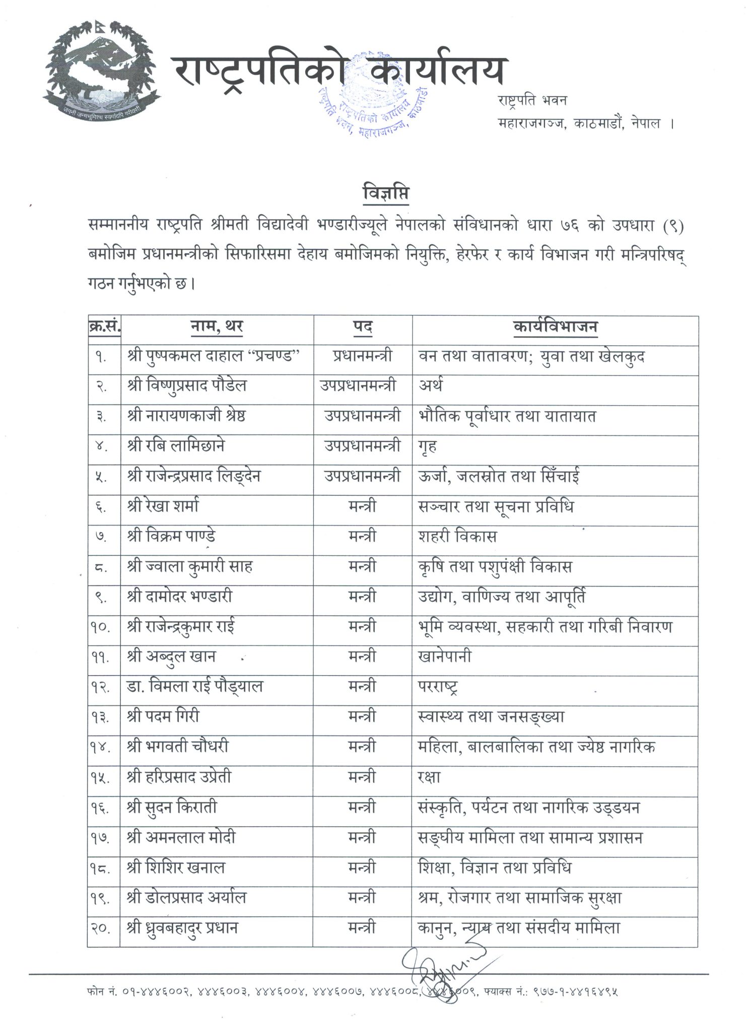 मंगलबार प्रचण्डले १ उपप्रधानमन्त्री, १५ मन्त्री र ३ राज्यमन्त्री नियुक्त भएका हुन् । नवनियुक्त मन्त्रीहरुले पद तथा गोपनियताको शपथग्रहणसहित कार्यभार सम्हालेका छन् ।