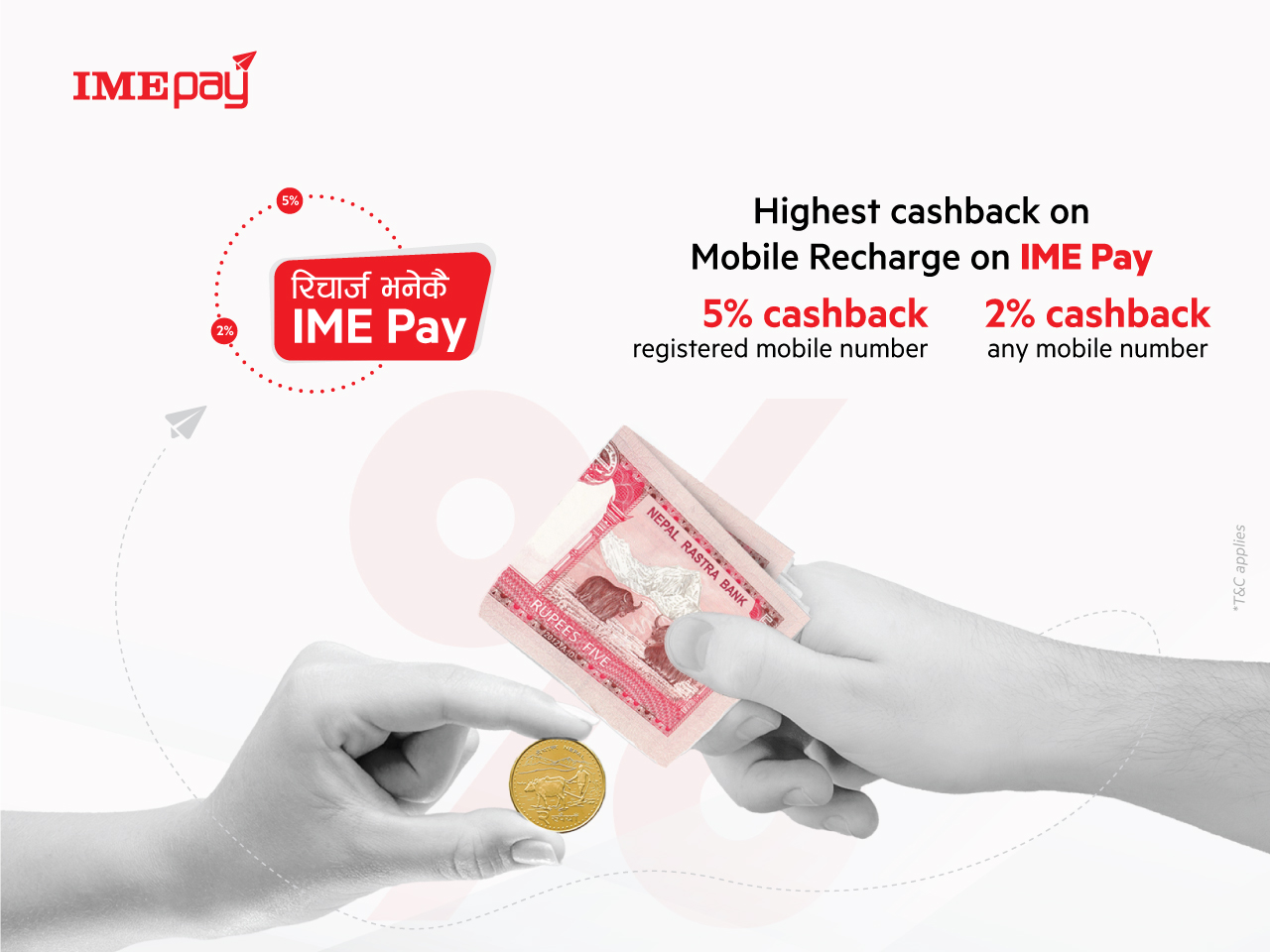 यस अफर मार्फत प्रयोगकर्ताहरुले ‘आइएमई पे’ एप दर्ता गरेको मोबाईल नम्बरमा मोबाईल ब्यालेन्स रिचार्ज गर्दा पाँच प्रतिशत क्यासब्याक र अन्य कुनै मोबाईल नम्बरमा मोबाईल ब्यालेन्स रिचार्ज गर्दा दुई प्रतिशत क्यासब्याक पाउने छन् ।