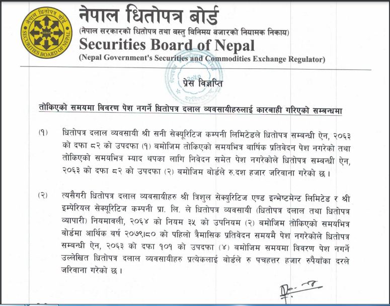 त्यसैगरी त्रिशुल सेक्युरिटिज एण्ड इन्भेष्टमेन्ट लिमिटेड र श्री इम्पेरियल सेक्यूरिटिज कम्पनी प्रा.लि.ले पनि धितोपत्र व्यवसायी (धितोपत्र दलाल तथा धितोपत्र व्यापारी) नियमावली, २०६४ को नियम ३५ को उपनियम (२) बमोजिम तोकिएको समयभित्र बोर्डमा आर्थिक बर्ष २०७९।८० को पहिलो त्रैमासिक प्रतिवेदन समयमै पेश नगरेकोले धितोपत्र सम्बन्धी ऐन, २०६३ को दफा १०१ को उपदफा (४) बमोजिम समयमा विवरण पेश नगर्ने उल्लेखित धितोपत्र दलाल व्यवसायीहरु प्रत्येकलाई ७५ हजार रुपैयाँका दरले जरिवाना गरेको बोर्डले जानकारी दिएको छ ।