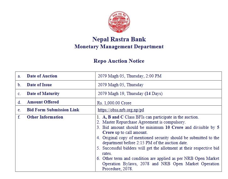 रिपो खरिदको लागि सो दिन दुई बजेसम्म बोलकबोल पेस गर्न सकिने छ । रिपो खरिदका लागि वाणिज्य बैंक, बिकास बैक र फाईनान्स कम्पनीहरुले भाग लिन सक्ने राष्ट्र बैंकको भनाई छ ।