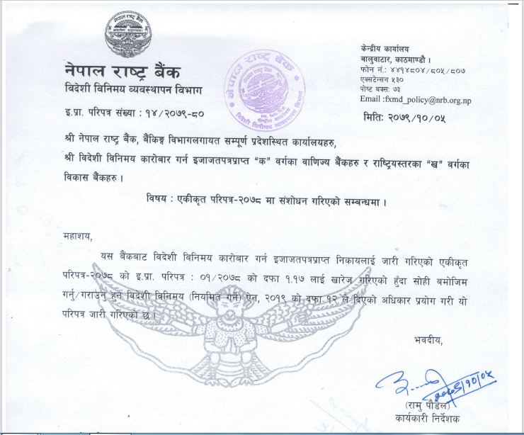 राष्ट्र बैंकले सोही बमोजिम गर्न गराउन बिदेशी बिनिमय नियमित गर्ने ऐन २०१९ को दफा १२ ले दिएको अधिकार प्रयोग गरी बैंक तथा फाईनान्स कम्पनीहरुलाई निर्देशन दिएको छ ।