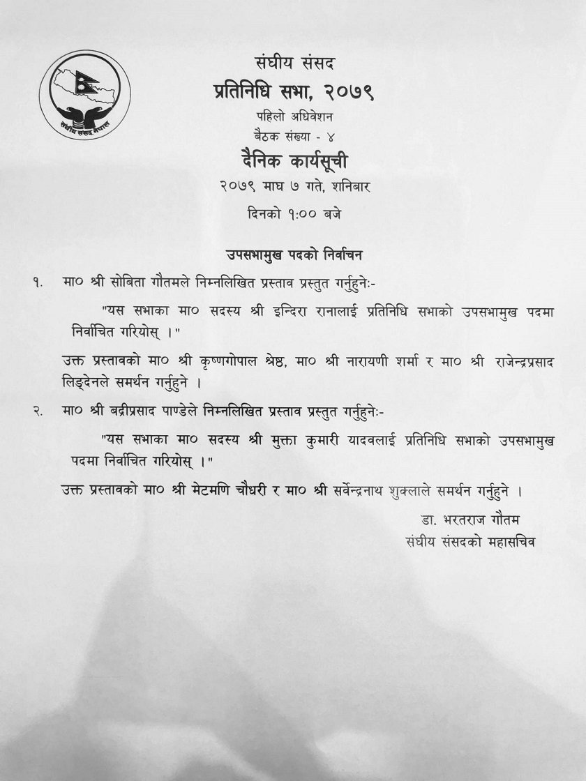 बैठकमा सत्ता गठबन्धनको तर्फबाट सांसद सोबिता गौतमले इन्दिरा रानालाई प्रतिनिधि सभाको उपसभामुख पदमा निर्वाचित गरियोस भनेर प्रस्ताव गर्ने र एमाले सांसद कृष्णगोपाल श्रेष्ठ, नारायणी शर्मा र राजेन्द्रप्रसाद लिङ्देनले समर्थन गर्ने कार्यसूची रहेको छ ।