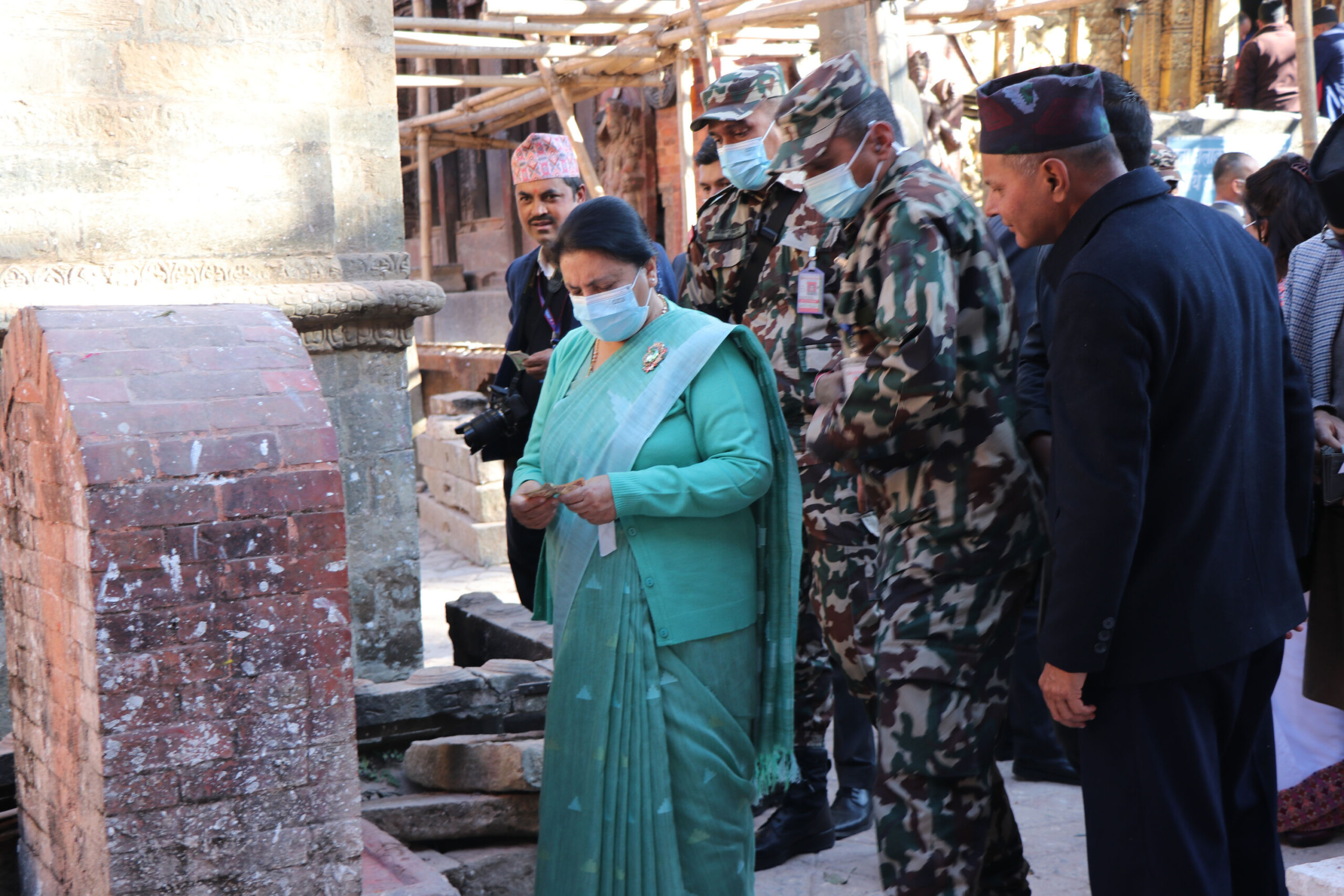 दरबार हेरचाह तथा स्मारक संरक्षण कार्यालय भक्तपुरकी प्रमुख अरुणा नकर्मीले पनि भूकम्पपछिको पुनःनिर्माणको अवस्थाका बारेमा राष्ट्रपतिलाई जानकारी दिए । मन्दिरको मूलपुजारी चक्रधरानन्द राजोपाध्यायले उनलाई टीका, फूल प्रसाद प्रदान गरे ।