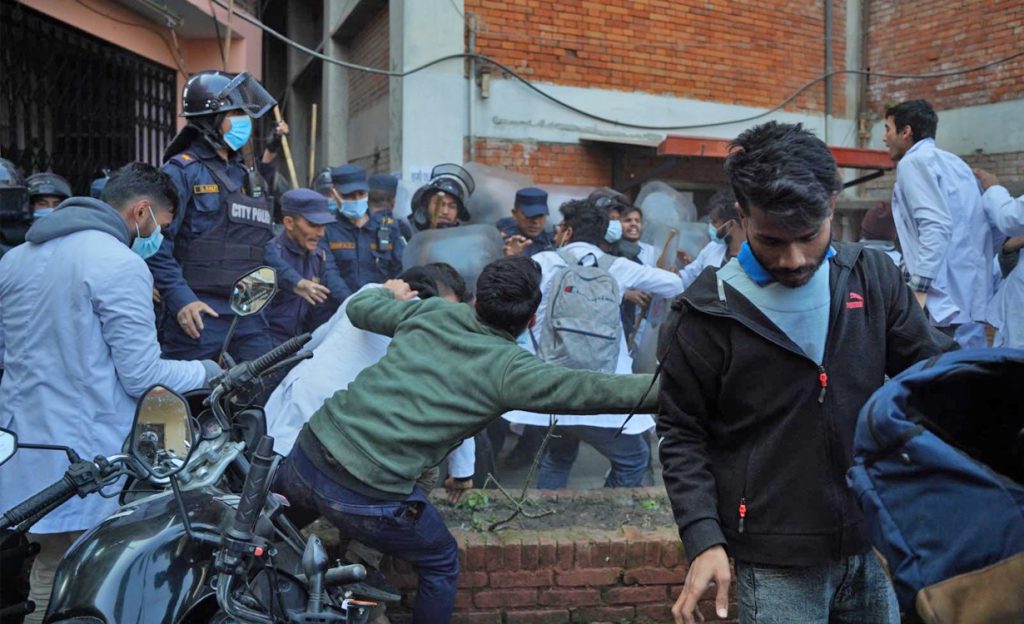 काठमाडौं । त्रिभुवन विश्वविद्यालय चिकित्सा शास्त्र अध्ययन संस्थान (आइओएम) का विद्यार्थी र प्रहरीबीच झडप भएको छ । काठमाडौंको महाराजगञ्जस्थित चिकित्सा शास्त्र अध्ययन संस्थान (आइओएम) मा मंगलबार झडप भएको हो । आइओएम डीनको कार्यालयमा विद्यार्थीले लगाएको ताला प्रहरीले खोलेपछि द्विपक्षीय झडप भएको हो ।