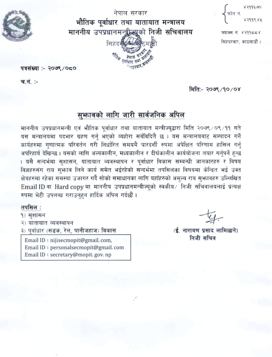 मन्त्री श्रेष्ठका निजी सचिव नारायणप्रसाद लामिछानेले जारी गरेको अपिलमा भनिएको छ, ‘सुशासन, यातायात व्यवस्थापन र पूर्वाधार विकाससम्बन्धी जानकारहरू र विषय विज्ञहरूसँग राय सुझाव लिने कार्यसमेत भइरहेको सन्दर्भमा समस्या समाधानका लागि सुझाव दिन अपिल गर्दछौं ।’