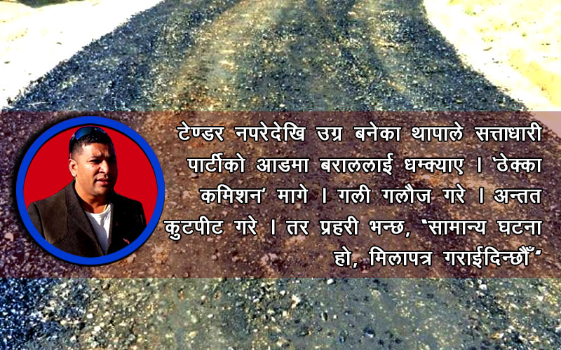 ‘मैले पाँचजना प्रतिस्पर्धीलाई पछि पार्दैै ईबिडिङ प्रक्रियाबाट टेण्डर पारेको हुँ’ निर्माण व्यवसायी पशुपति बराल भन्छन्, ‘ठेक्का परेपछि मलाई कमिशन बापत भन्दै २ करोड २५ लाख मागियो, त्यो रकम नदिँदा हाईलक्स गाडीले हानेर ज्यान मार्ने उद्योग गरियो ।’ उनका अनुसार यस भन्दा अगाडि पनि घरमा आफ्ना केटालाई पठाएर धम्क्याउने गरेका थिए ।