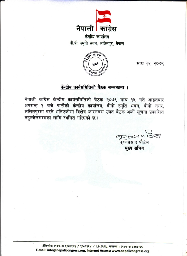 निर्धारित केन्द्रीय समितिको बैठक विशेष कारणवस अर्काे सूचना प्रकाशित नहुञ्जेलसम्मका लागि स्थगित गरिएको कांग्रेस केन्द्रीय कार्यालयका मुख्यसचिव कृष्णप्रसाद पौडेलले जानकारी दिएका हुन् ।