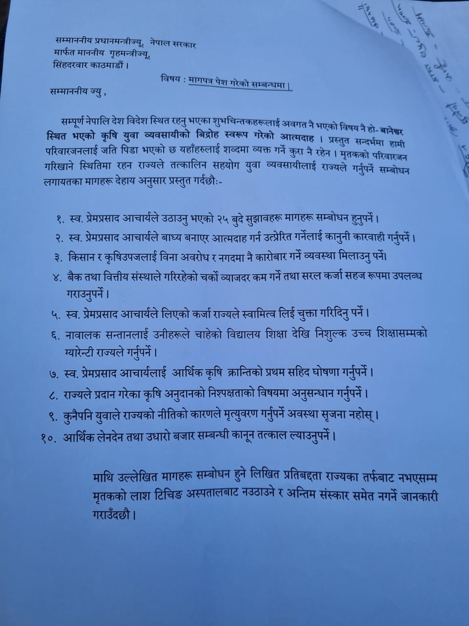 काठमाडौं । मंगलबार नयाँ बानेश्वरमा आत्मदाह गरेको प्रेमप्रसाद आचार्यको परिवारले सरकार समक्ष १० बुँदे शर्त राखेका छन् ।