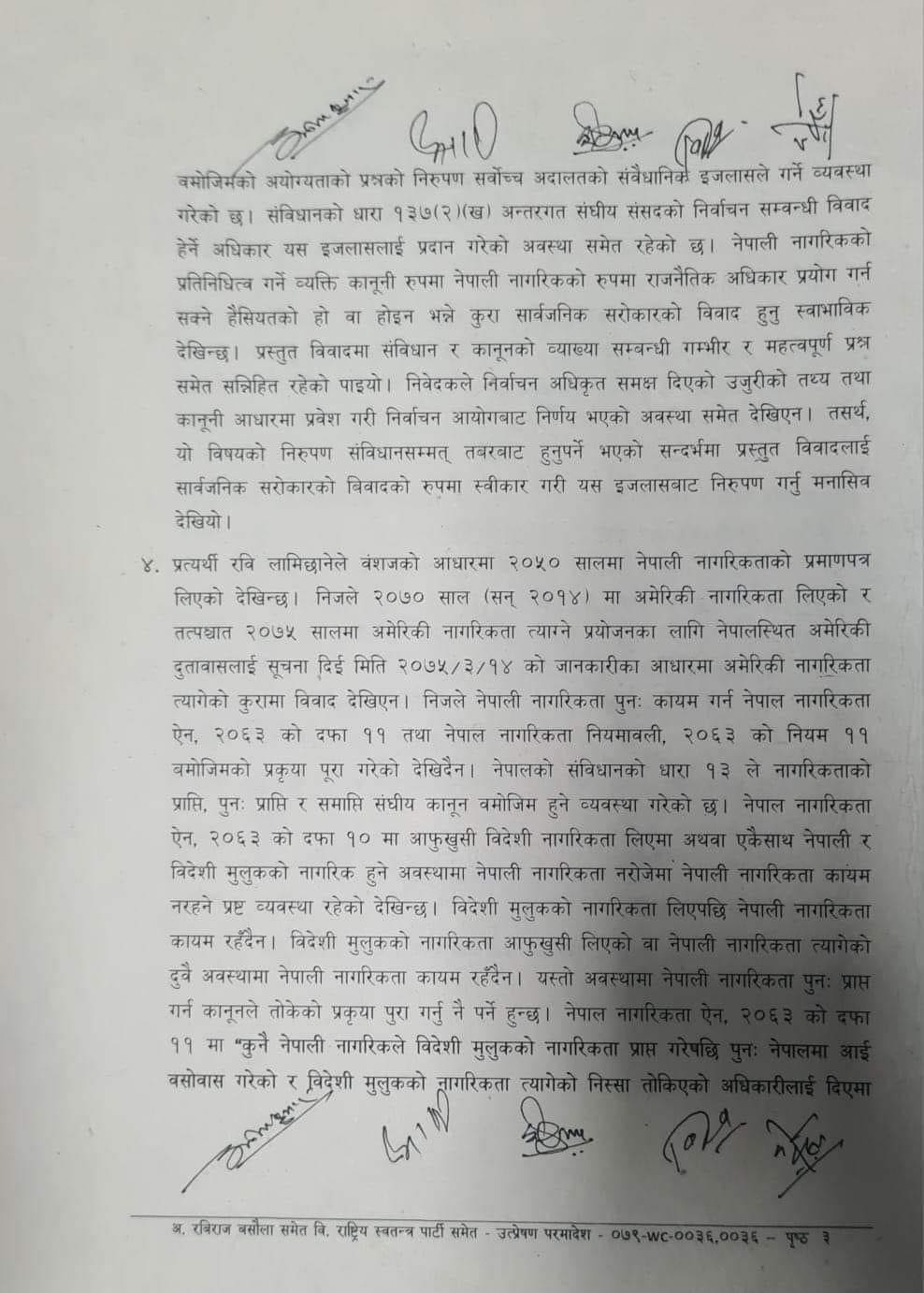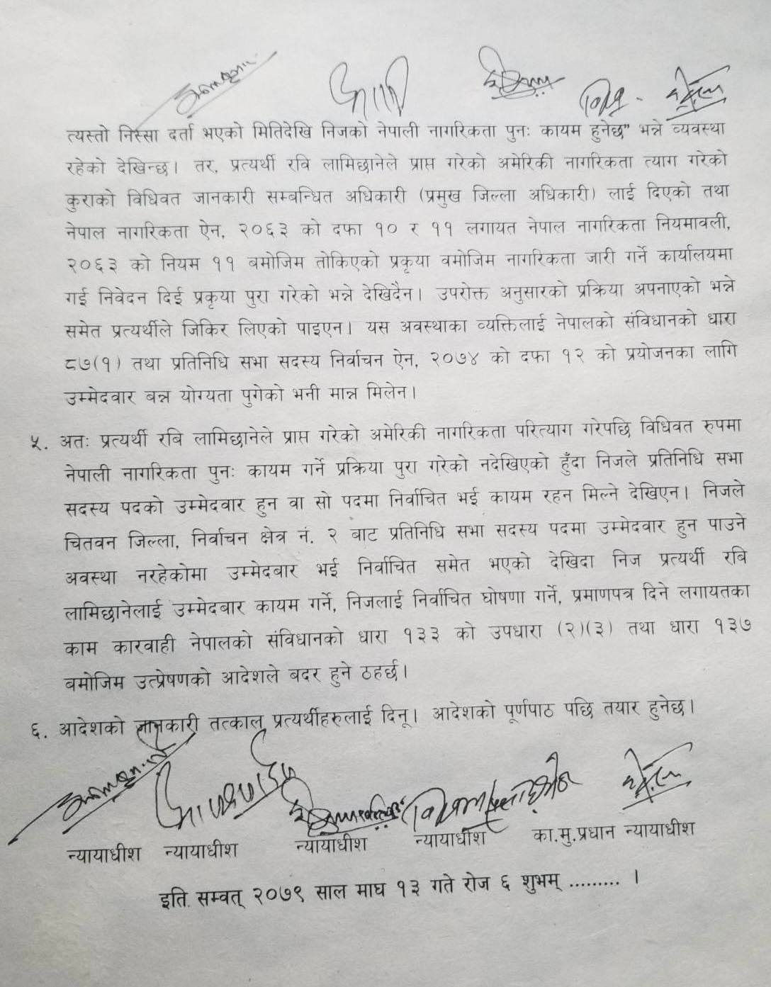 आज अदालतले लामिछानेले अमेरिकी नागरिकता परित्याग गरिसकेपछि नेपाली नागरिकता पुनः कायम गर्ने प्रक्रिया पूरा नगरेको भन्दै सांसद पद खारेज हुने फैसला भएको हो ।