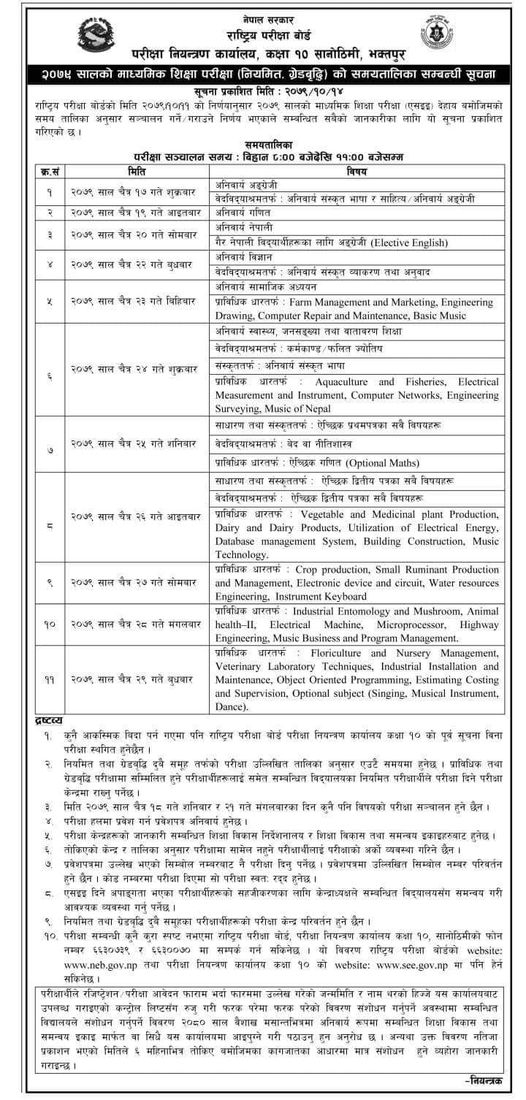 यसैबीच बोर्डले चैत १७ गतेबाट सञ्चालन हुने एसइईको परीक्षा तालिका सार्वजनिक गरेको छ । बोर्डले आज परीक्षा तालिका सार्वजनिक गरेको हो ।