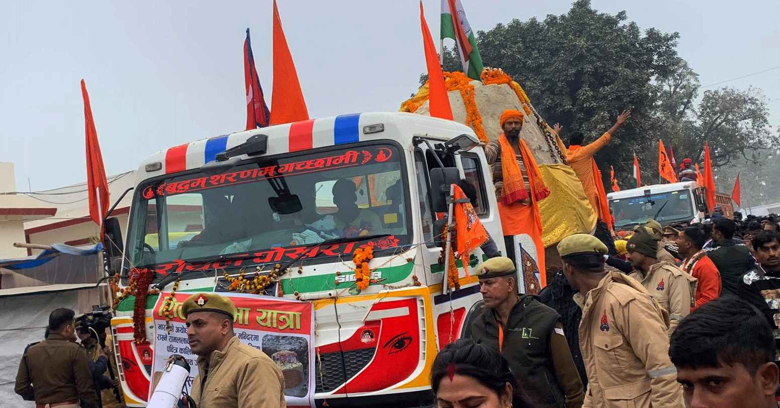 यही माघ १२ गते म्याग्दीको बेनी नगरपालिका–६ ठूलोपहिरोस्थित कालीगण्डकी नदी किनारबाट निकालिएको शिलासहितको टोली माघ १६ गते जनकपुरधामबाट अयोध्याका प्रस्थान गरेकामा दुई दिनपछि त्यहाँ पुगेको हो । अयोध्या प्रवेशसँगै श्रीराम जन्मभूमि तीर्थ क्षेत्र ट्रस्टका महासचिव चंपत रायले नेपाली प्रतिनिधिमण्डलको नेतृत्व गर्दै शिला ल्याएर पुगेकामा जानकी मन्दिरका महन्थ रामतपेश्वर दास, नेपाली कांग्रेसका नेता एवं पूर्वउपप्रधानमन्त्री विमलेन्द्र निधिसहितको टोलीलाई भव्य स्वागत गरेका थिए ।