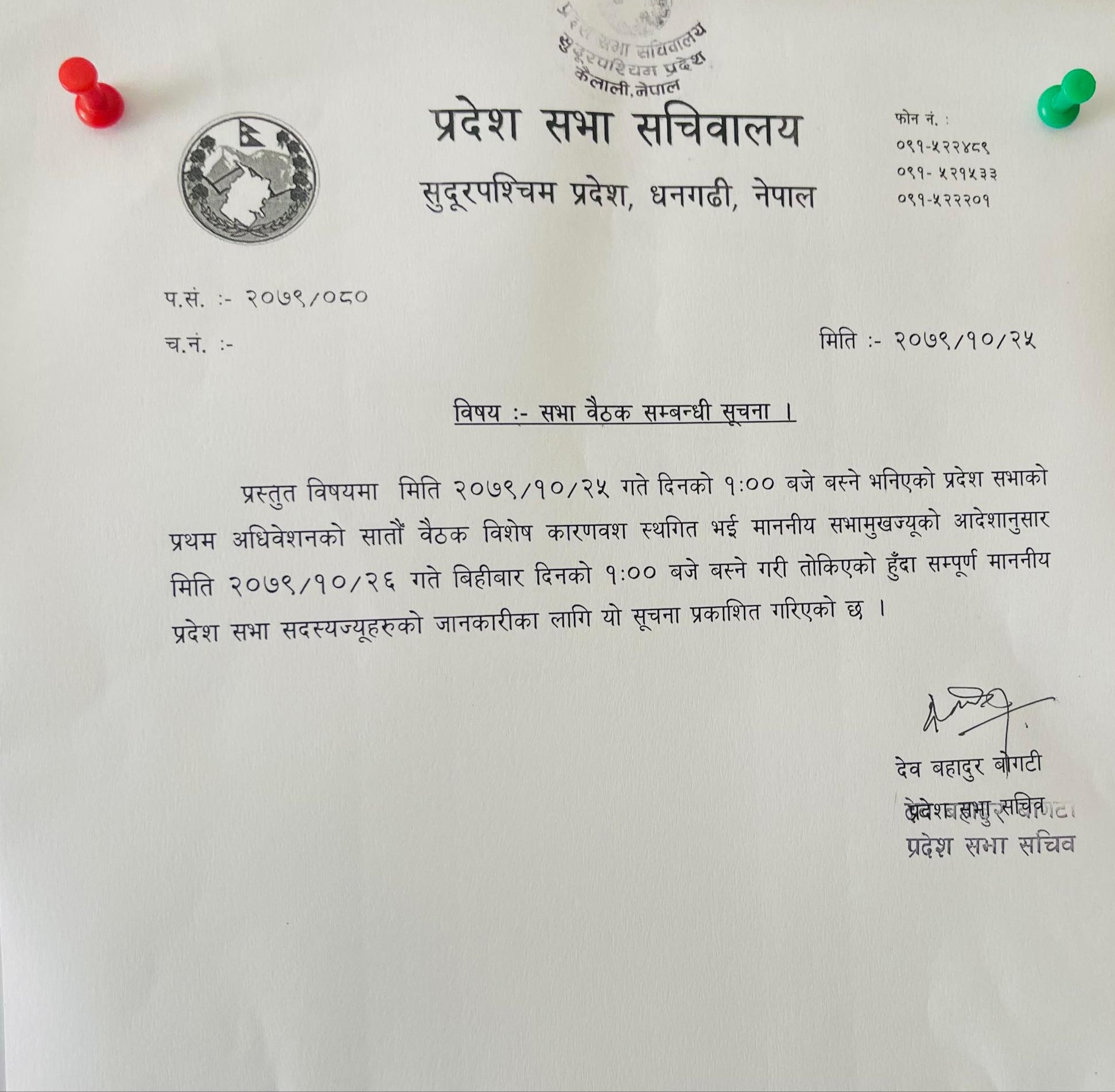 काठमाडौं । सुदूरपश्चिम प्रदेश सभाकाे बैठक स्थगित भएको छ । आज बस्ने भनिएको बैठक भोलि दिउँसो १ बजे बस्ने गरि स्थगित भएको प्रदेश सभा सचिवालयका सचिव देवबहादुर बोगटीले लोकपथलाई जानकारी दिए ।