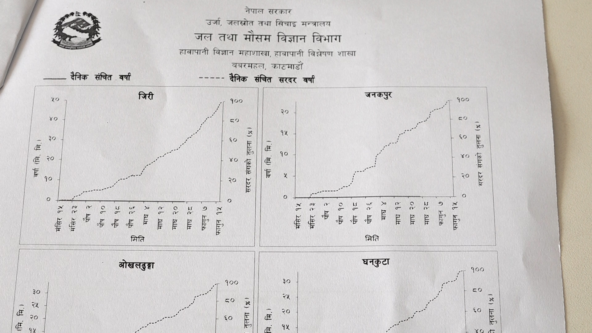 उनले भने, ‘मंसिर १५ देखि फागुन १६ को अवधि हिउँदे अवधि हो । यस अवधिमा औषत वर्षा ६०.१ मिलिमिटर हुनुपर्ने हो । तर अहिलेसम्म वर्षाको हिसावले हेर्ने हो भने ७.९ मिलिमिटर मात्रै वर्षा भएको छ । जुन १३.१ प्रतिशत मात्रै हो । यो भनेको लगभग ८६.९ प्रतिशत वर्षा भएको छैन । त्यस्तो अवस्थालाई खडेरीको अवस्था भनिन्छ । ५० प्रतिशत भन्दा बढी रेनफल डेफसेन्सी भयो भने एक्युट डाउटको अवस्था भनिन्छ । फागुन १६ सम्म पनि कडा खालको वर्षा हुने सम्भावना छैन । त्यो नदेखिनुको कारण समुन्द्र सतहको तापक्रम अहिले औषत भन्दा कम छ । भूमध्य सागरमा जुन खालको सिस्टम विकास भएर पश्चिमी वायु वहनुपर्ने हो, पश्चिमी वायु जति बहनुपर्ने हो त्यसको फिक्वेन्सी पनि घटेको र यसको बलियो पन पनि आउन सकेको अवस्था छैन । पश्चिमी वायु पनि कमजोर हुनु, भूमध्यसागको सिस्टम बन्नुपर्ने हो जसले पश्चिम वायुलाई प्रभावित गर्छ, त्यहाँ पनि कमजोर हुनु र प्रशान्त महासागरको केन्द्र र समुन्द्रको पूर्वी दिशामा पनि कमजोर हुनु र अहिलेको अवस्थामा लालिना कण्डिशन भन्छ, यो भनेको समुन्द्रको सतहको तापक्रम ५० वर्ष भन्दा यताको अहिले कम छ । ३० वा त्यो भन्दा बढी समयमा कुनै कुरा औषतभन्दा कम भयो भने, औषत वा त्यो भन्दा माथि भयो भने त्यो जलवायु परिवर्तनको कारक हो । वाष्पीकरण भएर आउने बाफ नै बनेन जसले वायुमण्डलको हावा कमजोर भयो, पश्चिमी वायु नै बनेन । पानी र हिउँ पार्ने सिस्टम नै भएन । यो सुख्खा खडेरीको अवस्था हो । यसले हिउँदो बाली, पारिस्थितिय प्रणाली, वन सम्पदादेखि सबैमा यसको असर हुन्छ । त्यो असर भनेको हाम्रो जीविकोपार्जनमा पर्ने असर हो । यसले ल्याउने असर भनेको होल हाइड्रो लोजिकल सिस्टममा अर्थात पानीको मुहान सुक्ने, मुहानमा पानी कम हुने, चुरेबाट उत्पति हुने नदीनाला सिस्टम जुन छ,त्यसमा पानीको मात्रा कम हुन्छ । हाम्रो कृषि प्रणालीमा पनि असर गर्छ । कृषि उत्पादन घट्छ । खाद्य सुरक्षामा पनि असर गर्छ । समग्रमा यो अहिलेको परिस्थिति लामो समयको औषत भन्दा समुन्द्र सतहको तापक्रम कम हुनु, पश्चिमी वायु कमजोर हुनु, त्यसले गर्दा वाष्पीकरण नहुनु र वर्षा कम भएको अवस्थाले हामीलाई समग्रमा वातवरणमा यसको असर परेको छ । वायु प्रदुषणको अवस्था बढ्दो छ । कृषि प्रणालीमा कमजोर भयो भनेपछि भोकमरीको समस्या, हिमाली, उच्च पर्वतीय क्षेत्रमा कर्णाली, मुगु, डोल्पा जस्तो सुदूरपश्चिमको पहाडी क्षेत्रमा त्यता अलि पानी परेको थियो तर काठमाडौंतिर पानी नपरेका जुन क्षेत्र छन्, त्यो क्षेत्रमा खडेरी भयो भने त्यसले खाद्यान्न उत्पादन कम भयो, खाद्य सुरक्षाका लागि राज्यले जोहो गर्नुपर्ने पक्ष के हो भने नेपालमा अब उत्पादन कम हुन्छ भनेर हिउँदे अवधिमा हुने उत्पादनको सुरक्षामा शतर्कता अपनाउ
